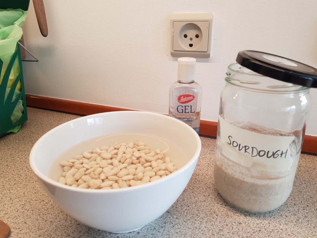 In a crazy display of #coronacrisis wealth, I’m hanging with a bread leavener, some white beans (actually not sure if that’s a display of wealth), and some prized Mexican hand sanitizer.